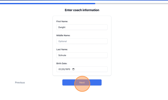 6. Enter coach's contact information > Click 'Continue'